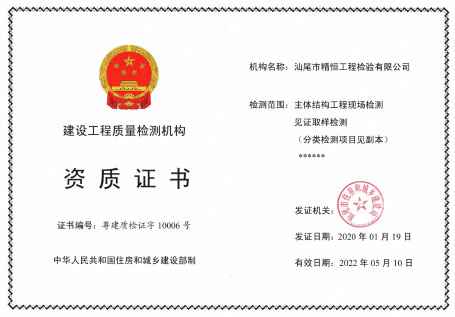 本公司2019年1月首次通过广东省市场监管局资质认定(计量认证),证书编号为:201919024159.通过计量认证项目有建设(地质勘察、公路交通、水利)工程质量检测1个领域8个大类 68产品类别769个参数。主要检测业务包括:主体结构工程现场检测;钢结构工程检测;地基基础工程检测;建筑幕墙工程检测;建筑节能检测;雷电防护装置检测;建筑工程施工现场安全防护用品检测;新材料检测服务(第三方检测、检测、测试、分析、认可、计量活动);产品质量、性能、安全性等检测服务;涉及结构安全项目的抽样检测;对进入施工现场的建筑材料、构配件的见证取样检测;人防工程检测;房屋安全检测(鉴定);岩土工程;混凝土工程;金属结构;噪声与振动防控监测服务;水污染监测服务;生活废水监测服务;环境保护监测;建筑工程测量;市政工程测量等建设工程质量的检验检测工作。